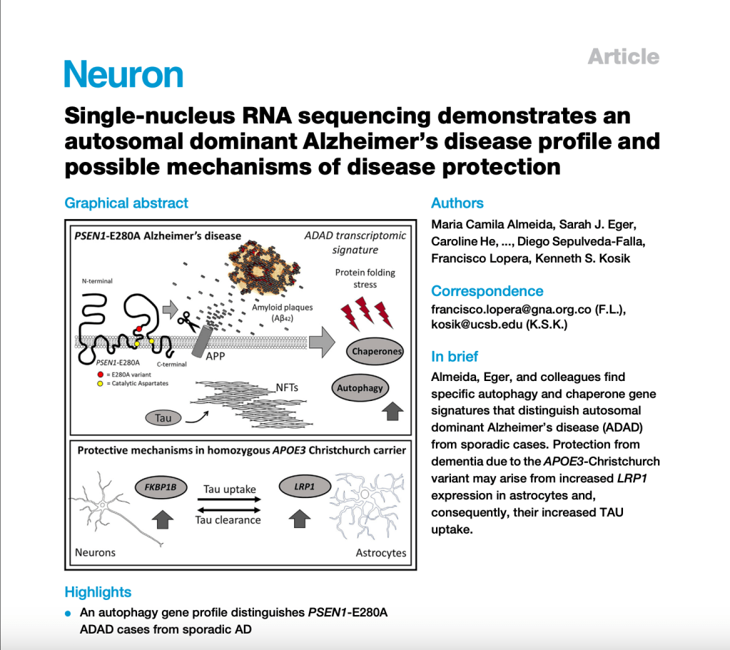 Almeida, M. C., Eger, S. J., He, C., Audouard, M., Nikitina, A., Glasauer, S. M. K., Han, D., Mejía-Cupajita, B., Acosta-Uribe, J., Villalba-Moreno, N. D., Littau, J. L., Elcheikhali, M., Rivera, E. K., Carrettiero, D. C., Villegas-Lanau, C. A., Sepulveda-Falla, D., Lopera, F., & Kosik, K. S. (2024). Single-nucleus RNA sequencing demonstrates an autosomal dominant alzheimer’s disease profile and possible mechanisms of disease protection. Neuron, 112(11). https://doi.org/10.1016/j.neuron.2024.02.009