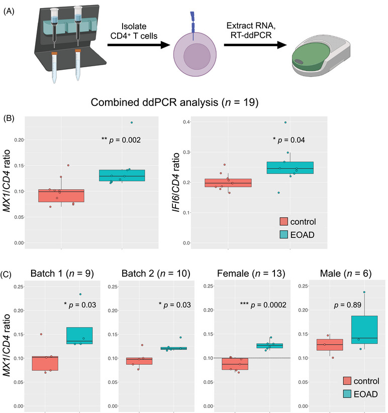 To validate their initial findings, researchers assessed ISAGhi marker genes in a second cohort of EOAD and healthy participants through droplet digital PCR. They found increased expression of the MX1 and IFI6 antiviral genes. Most notably, increased MX1 expression was consistent with previous findings and was driven by females in this cohort as well. Researchers did not find these ISAGhi T cell expansion in late onset mild cognitive impairment (MCI) or AD patients, suggesting that this may be unique to EOAD even though upregulation of the same interferon signaling pathway is conserved in late onset MCl/AD.